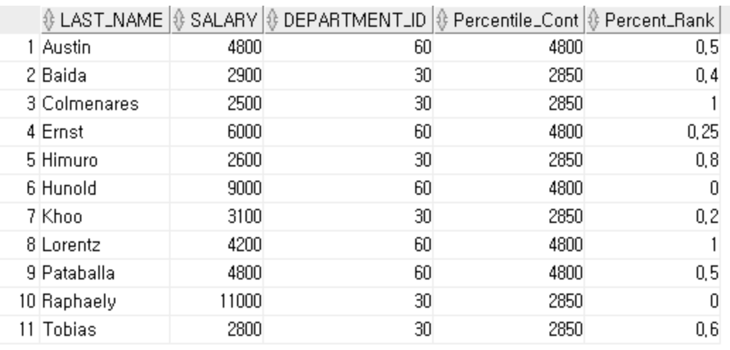 example1) 다음 예에서 부서 60의 중간값은 4800이며 해당 백분위 수 (Percent_Rank)는 0.5이다.