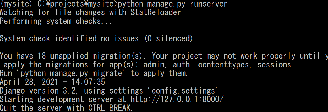 (mysite) C:\projects\mysite>python manage.py runserver