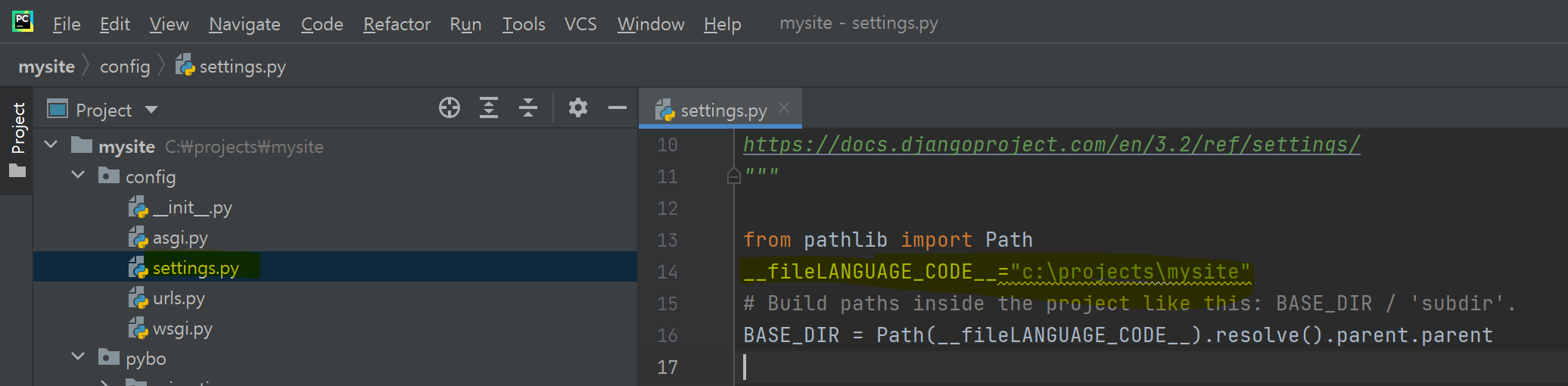 File "C:\projects\mysite\config\settings.py", line 16, in <module>
