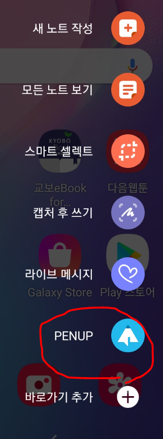 Pen을 꺼내들고, Pen 전용 메뉴를 선택합니다.