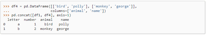 3) axis=1 설정하여, x축을 따라 DataFrame 개체를 수평으로 결합