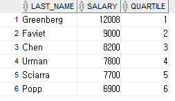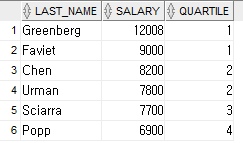 SELECT last_name, salary, NTILE(4) OVER (ORDER BY salary DESC) AS quartile